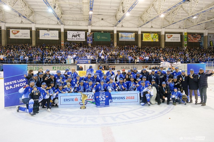 A csíki kék-fehérek a 2010–2011-es, HSC Csíkszereda néven aratott diadal, aztán a Ferencvárossal megosztott 2020-as bajnoki cím, illetve a tavalyi siker után a negyedik alkalommal szerezték meg az aranyérmet az Erste-, illetve korábban MOL Ligában.