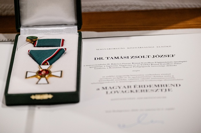 A Magyar Érdemrend Lovagkeresztje kitüntetést vehette át pénteken reggel a marosvásárhelyi főtéri plébániatemplomban dr. Tamási Zsolt, a II. Rákóczi Ferenc Római Katolikus Gimnázium volt igazgatója. A diákokkal teli templomban a kitüntetést Tóth László csíkszeredai főkonzul adta át.