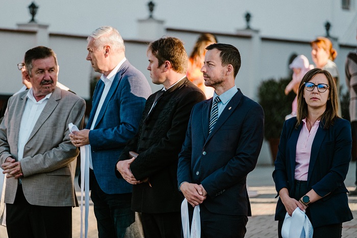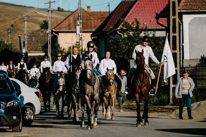 Péter Ferenc, Maros megye tanácsának elnöke is üdvözölte a jelenlévőket, és örömét fejezte ki, hogy itt lehet, amikor elindulnak a lovas zarándokok Csíksomlyóra. Márton Áron szavai aktuálisak minden időkben. Szelleme ma is élő, ma is képes arra, hogy távolságokat legyőzve, lelki gátakat felszakítva egyesítse a nemzetét – emelte ki a megyei elöljáró, utalva az imaszalagra, amelyet feltűzött a lovas keresztjére.
