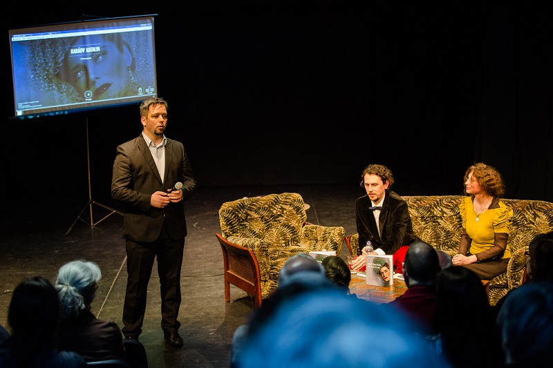 Az est háziasszonya, Szebeni Zsuzsa bevallotta: otthon érzi magát a Csíki Játékszínnél, lévén, hogy húsz éve maga is színházi referensként kezdte, ezért is köszönte a szervezői partnerséget a színházi intézmény igazgatójának, Parászka Miklósnak és Szabó Noémi referensnek. A kolozsvári születésű igazgató a továbbiakban bensőséges hangulatú beszélgető estté alakította a könyvbemutatót, nem csupán a Karády-kötet szerzőjét, a vajdasági származású Péter Zsolt színháztörténészt, hanem Márdirosz Ágnes csíkszeredai színművészt is belevonva a társalgásba, aki intermezzóként Karády-dalokat szólaltatott meg, Ráduj Gábor zongorakíséretével.