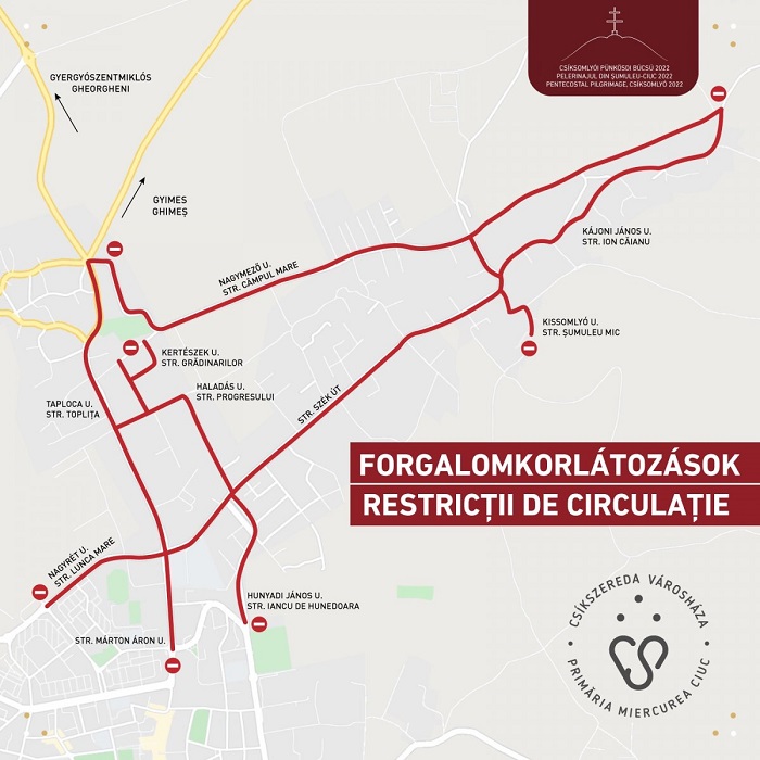 A csíkszeredai önkormányzat sajtóközleményben hívja fel a figyelmet, hogy a zarándokok által használt csíksomlyói útvonalakat pénteken este tíz órától lezárják az autós forgalom előtt, majd a búcsús tömeg elvonulását követően fokozatosan felszabadítják.