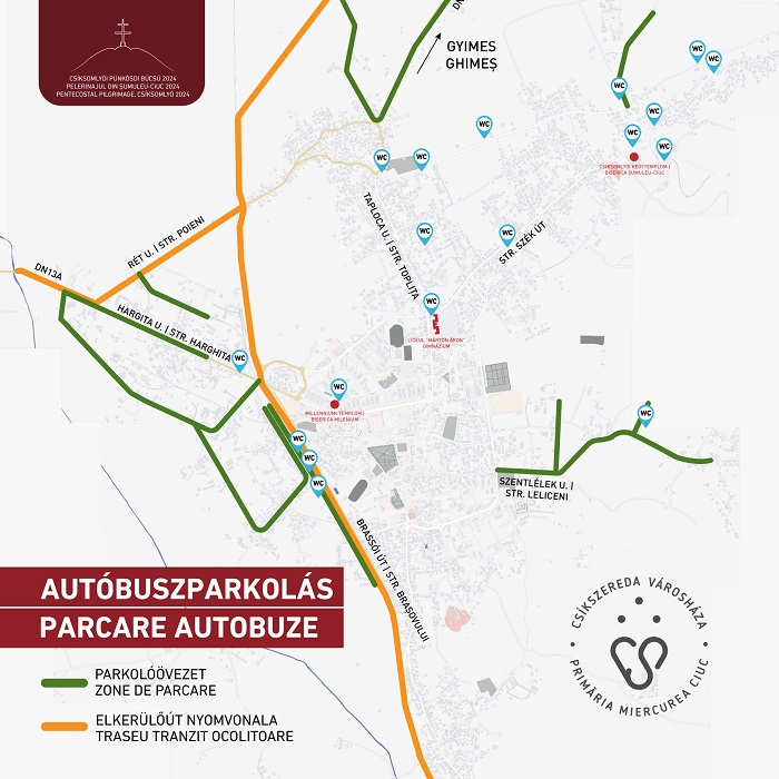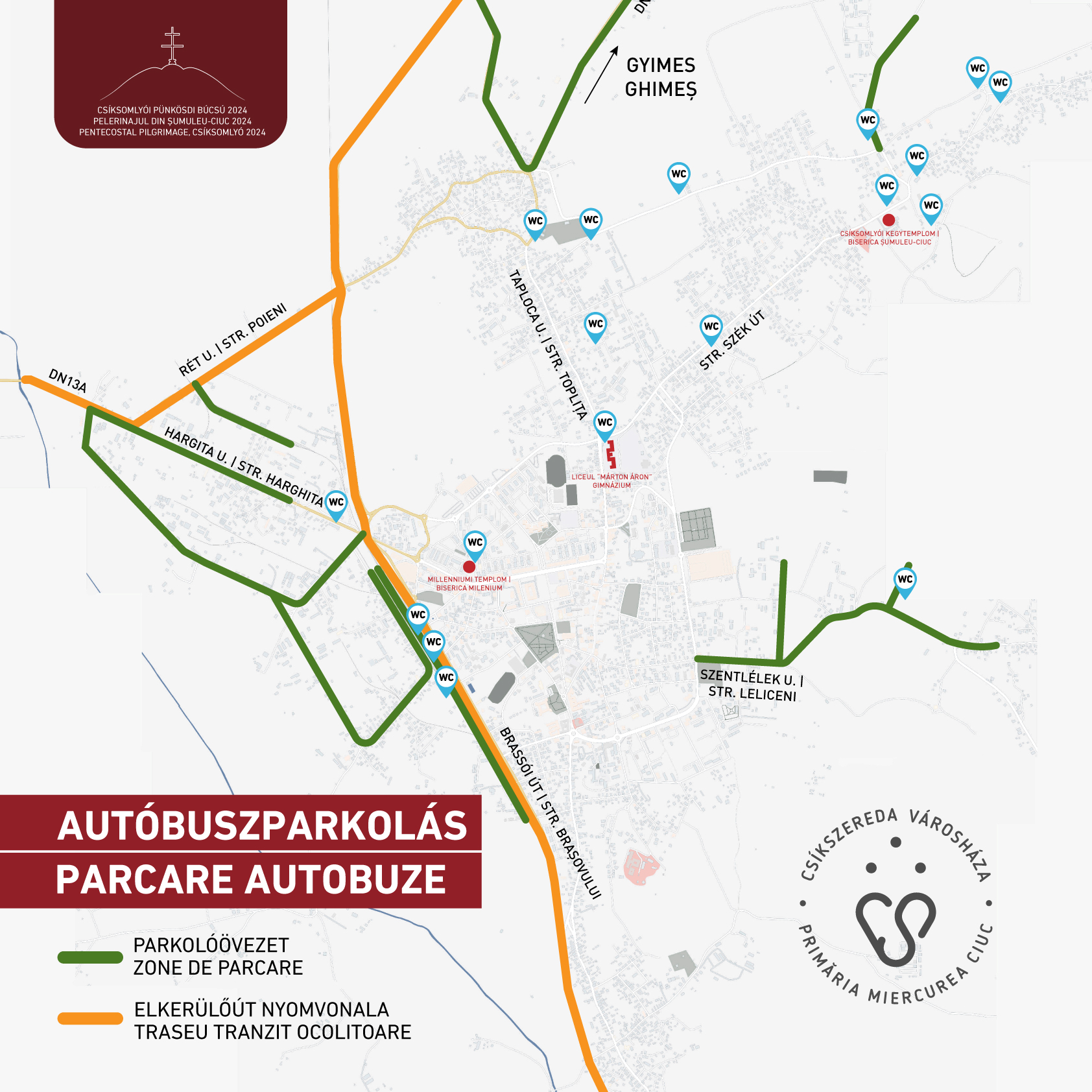 Az autóbuszok parkolása idén is szervezetten, hatósági segítséggel történik. A nyugati irányból, Székelyudvarhely felől érkező buszok a Hajnal, az Akác, a Fürdő és a Baromtér utcákban, továbbá az ipari övezet északi részén, a Rét utcáról az egykori mészárszék felé vezető utcában is parkolhatnak. Idén már a Hargita utca két oldalán is parkolhatnak, a négysávos szakaszon.