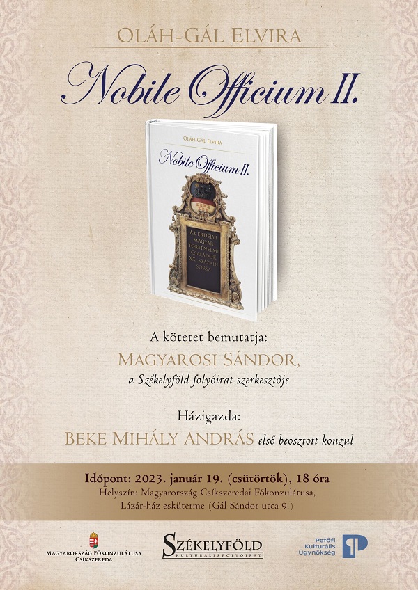Oláh-Gál Elvira Nobile Officium II. című könyvét mutatjuk be január 19-én, csütörtökön 18:00 órától Magyarország Csíkszeredai Főkonzulátusán, a Lázár-ház eskütermében. A kötetet bemutatja: Magyarosi Sándor, a Székelyföld folyóirat szerkesztője. Házigazda: Beke Mihály András első beosztott konzul. Az eseményre minden érdeklődőt szeretettel várunk.